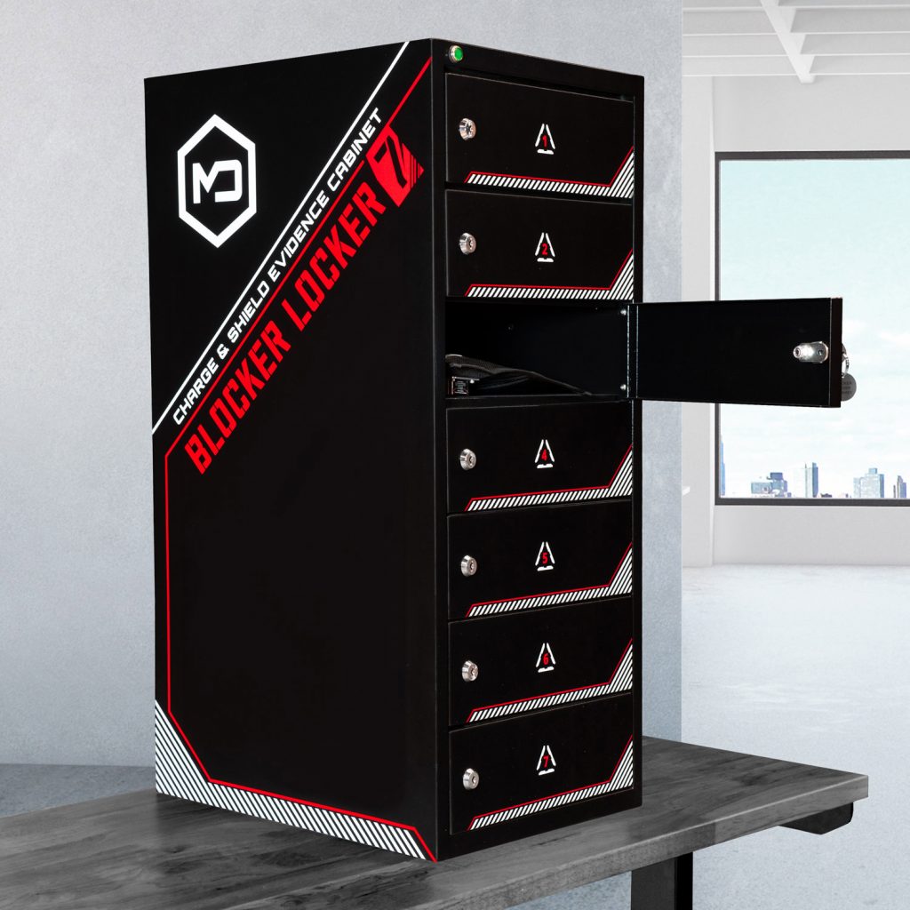 The Mission Darkness™ Blocker Locker 7™ system solves several problems for forensic investigators and laboratories. In order to effectively access and recover data from mobile phones and tablets, the devices must remain powered on when using the latest forensic tools. It can be difficult to protect devices from RF signals, keep them constantly charged, and keep them securely locked away. The Blocker Locker 7 meets all these requirements in a single cabinet designed specifically for shielding, charging, and locking. The device includes seven fully equipped compartments with Window Charge & Shield Faraday Bags for phones, while additional Charge & Shield Faraday Bags can be purchased as needed or to increase capacity.