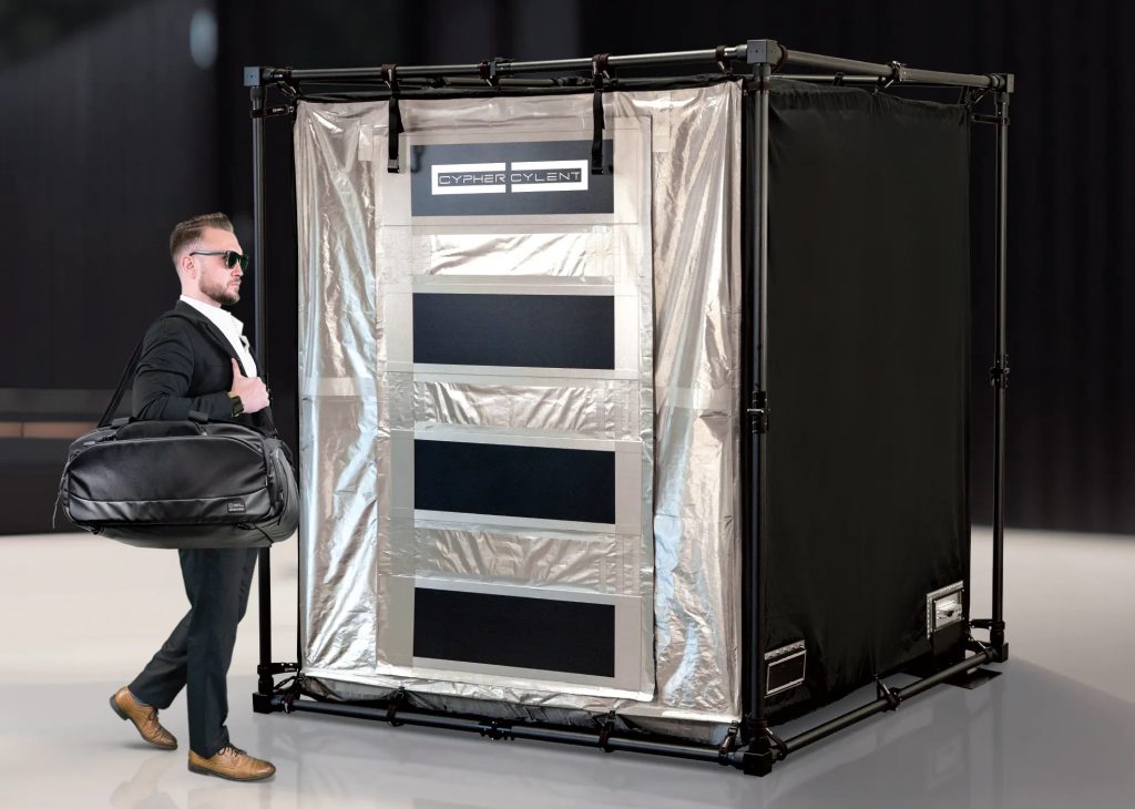 Es sind mehrere Zeltvarianten erhältlich, darunter das CYPHERCYLENT Faraday-Zelt mit Vorraum.